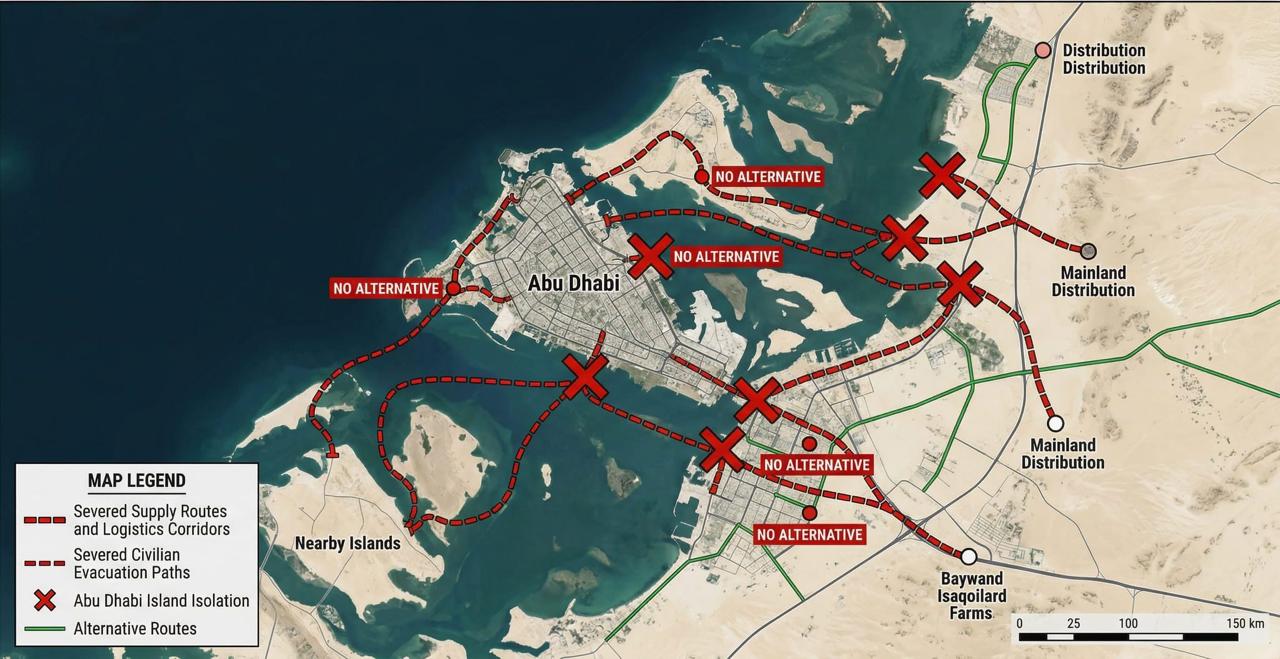 The video below is taken from Al Jazeera's news bulletin from April 3rd, with a local reporter for AJ Arabic on the ground in Karaj. He makes it clear that the bridge had no military significance, yet the double strike was meant to destroy it as well as to kill and injure people around it. It was an undoubted war crime, as well as a strike against a purely civilian target. And as such, is guaranteed to produce a response in kind against the US-israeli collaborators in the Gulf from whence most strikes come. Within hours the IRGC issued a map showing bridges around Abu Dhabi that could be targeted, highlighting the Emirate's extreme vulnerability to 'bridge attack', and justifying a variation on the saying "people who live in glass houses shouldn't throw stones" - - "People who live on islands shouldn't bomb bridges". Unlike the Karaj bridge - evidently constructed to improve traffic conditions around the city rather than as a necessary river crossing, bridges to Abu Dhabi city are its only link to the land, and given the current status of sea traffic in the Persian Gulf, that link is now a fundamental necessity for survival. As the leading illustration shows, there are eight such bridges, so we wait to see how many Iran chooses to attack, or whether other equally significant targets will do. Iran may well choose not to alienate the Gulf states further, in the hope they will sooner or later see the light and ask the US forces to leave. And it will surely be sooner rather than later as the Hormuz 'choke-point' turns to a stranglehold on non-compliant states, and residents and investors watch as other countries do 'deals' with Iran in exchange for Persian gulf access.
